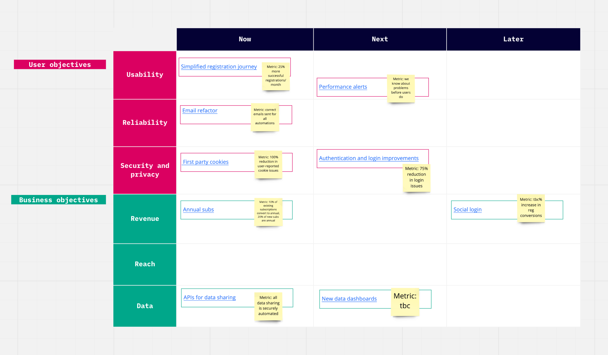 I’ve been using a Miro template called “Agile product roadmap”, which does 80% of the job on its own, and I’ve added the other 20% in the shape of the core business objectives, the metrics, and links to the relevant Jira epic, so that for those people who want the detail, it’s very easy to find. I’m using this format with a client who’s at a relatively early stage in the development of their product, so at the moment we’re having monthly roadmap reviews to keep us on track (or to rip everything up and start again, depending on what sort of a month it’s been). It’s light-touch, easy to understand and by including the overall objectives as well as the specific success measures, it makes sure we stay focused on the why, as well as the what and the how.